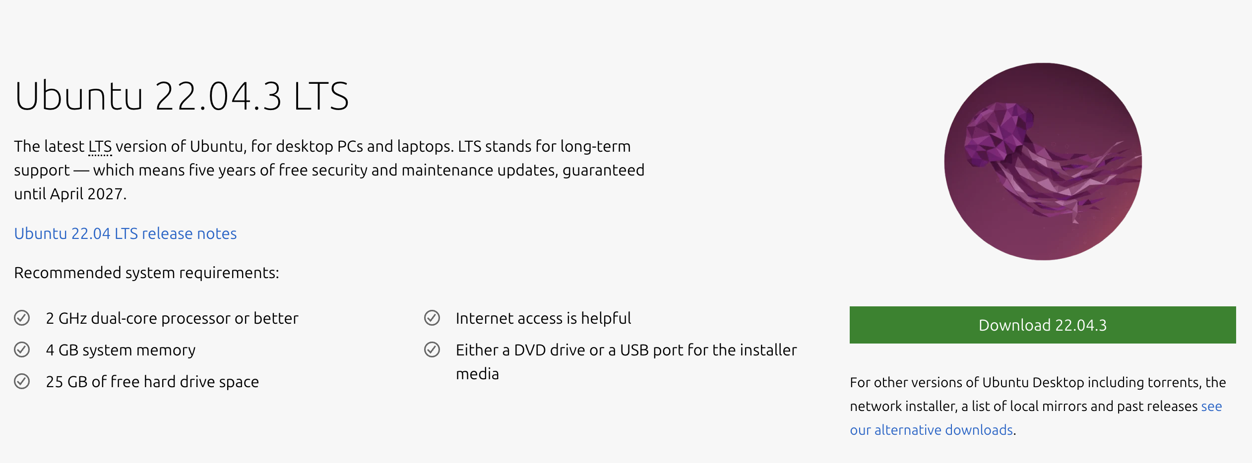 - 우분투 설치 페이지로 이동해 이미지를 다운로드한다. 저는 22.04.3 LTS를 다운로드하였습니다.