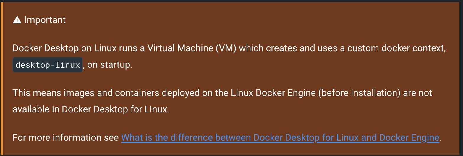 저는 도커 설치 단계에서 시행 착오를 겪었습니다. 도커 데스크탑이 편리하긴 하지만, nvidia-container-toolkit에서 도커 데스크탑은 지원하지 않는다고 합니다. 정확한 이유는 알 수 없지만, 도커 데스크탑이 VM 환경에서 동작하기 때문이 아닐까 추측합니다. 더욱 궁금하신 분은 도커 데스크탑과 도커 엔진의 차이점을 설명해둔 공식 홈페이지의 글을 읽어보세요. 요약하자면, 두 가지를 동시에 설치해도 되지만, 도커 데스크탑을 사용할 때는, port 충돌 오류 등이 발생할 수 있으니, 로컬의 도커 엔진은 끄고 사용하라는 등의 설명이 되어있습니다.