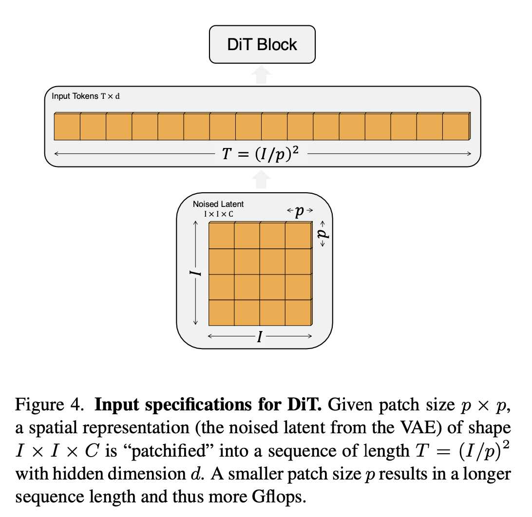 DiT를 설계할 때, 표준적인 ViT의 scaling property들을 유지하고자 했다고 한다. 따라서, ViT의 모범 사례들을 잘 유지하고 있다고 하며, 이 챕터에서는 patchify, DiT Block design, Model size, Transformer Decoder에 대해서 자세히 설명한다.