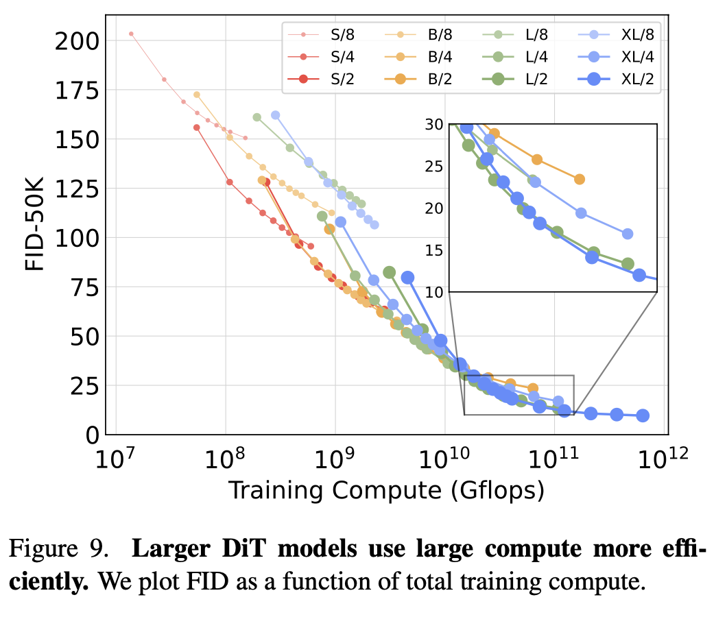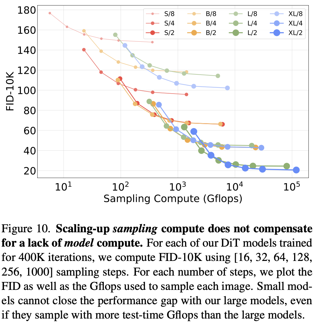 - Larger DiT models are more compute-efficien: 어느 정도의 Gflops 이상으로 가면, 큰 모델이 성능 대비 연산량 또한 효율적이었다고 한다.