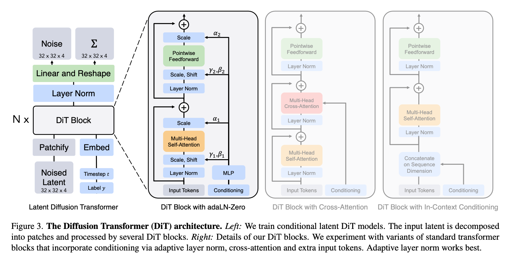 - In-context conditioning: ViT의 CLS 토큰과 유사한 방식으로, 추가적인 조건부 입력 $t$, $c$ 토큰을 input sequence 마지막에 붙여서 contextualizing을 시켜보았다고 한다. 이후, 마지막 block에서 이 추가적인 토큰을 제거한다. 이 방식은 Gflops에는 거의 영향을 미치지 않았다고 한다. Figure 3의 마지막 block design